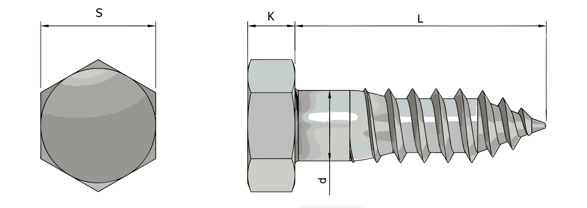 DIN 571 Шурупи є стрижнем з неповним великим різьбленням, гладкою частиною і мають головку з шістьма гранями під гайковий ключ.
