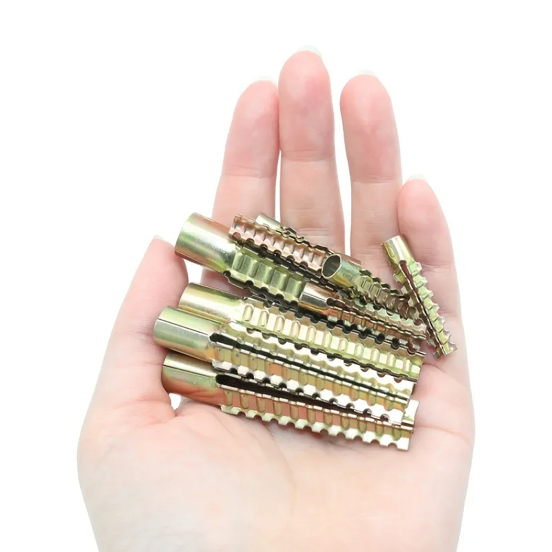 Металлический анкер представляет собой цилиндрическую втулку с распорной частью в виде четырех конусообразных сегментов с зубчатой поверхностью. Он забивается в пористый материал без предварительного сверления. При закручивании болта происходит расширение дюбеля в отверстии. Его зубья врезаются в бетон, что увеличивает надежность сцепления с основой.