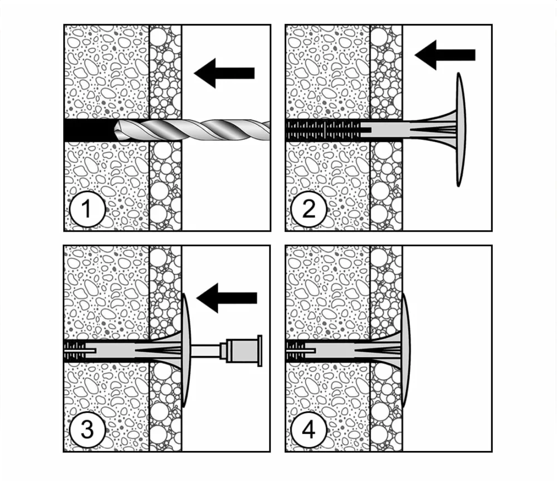 Рекомендується 5-6 дюбелів на 1 м2. Мінімальна глибина анкерування в щільні матеріали – 50 мм.