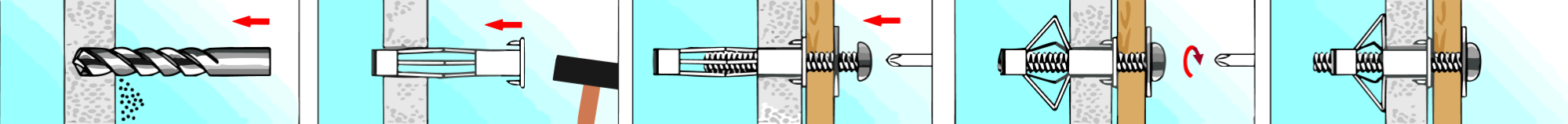 При фіксації в отвір дюбель встановлюється у закритому вигляді. Тільки при загвинчуванні гвинта відбувається зміна форми дюбеля Моллі, який є опорою конічного типу або парасольки. Вона щільно фіксується в отворі. Сам гвинт встановлюється трохи інакше, якщо порівнювати зі звичайними дюбелями. Його не потрібно вкручувати. Гвинт витягується спеціальним інструментом. Скористайтеся плоскогубцями для встановлення кріплення в робочому стані. Такий вид монтажу дозволяє повторно використати дюбель Моллі. За бажання ви легко демонтуєте його з отвору без втрати властивостей металовиробу.