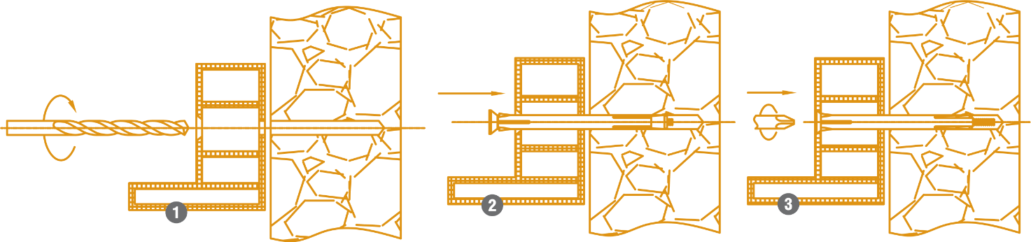 Просвердлити отвір діаметром дюбеля, вставити дюбель, закрутити шуруп.