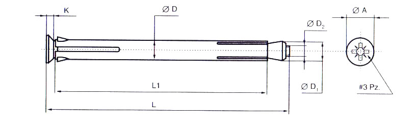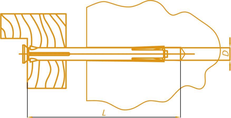 Конструкція рамного дюбеля нагадує полегшений анкерний болт із потайною головкою: різьбовий стрижень із конусною гайкою на кінці закріплений у цанговій гільзі.