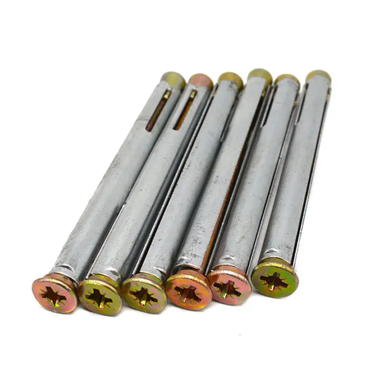 Конструкция рамного дюбеля напоминает облегченный анкерный болт с потайной головкой: резьбовой стержень с конусной гайкой на конце закреплен в цанговой гильзе.