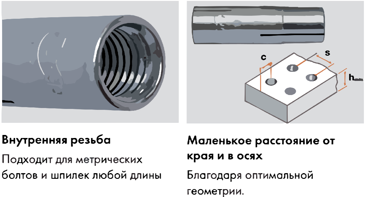 Забивний нержавіючий анкер являє собою металеву втулку, відмінні частини якої: внутрішнє метричне різьблення і зона, що розклинюється для використання в дуеті зі шпилькою, гвинтів або болтом.