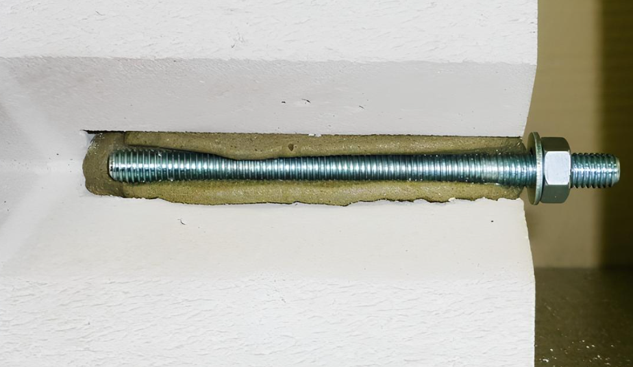 Химические. Для установки болта используются двухкомпонентные смолы, наполнители и отвердители. Смесь заливается в проем, затем в нее устанавливается анкер. На схватывание раствора уходит от 3 до 24 часов. Крепеж запрещается нагружать до затвердевания смеси. Это приведет к смещению элемента или повреждению клея.