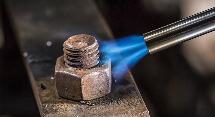 Смазка не помогла? Идем дальше – нагреваем соединение строительным феном, паяльной лампой или газовой горелкой. Если болт не очень большой, можно обойтись турбозажигалкой или обычной газовой конфоркой. Греем несколько минут, чтобы металл расширился, а окислы разрушились. Во время нагрева, к слову, разрушается и уплотнительный материал, который мешает откручиванию.