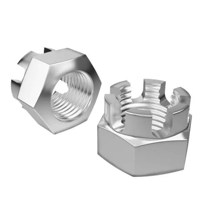 DIN 935 - гайка корончатая. Это шестигранная гайка с радиально расположенными прорезями под шплинт. Использование шплинта исключает самопроизвольное раскручивание гайки. Применяются в болтовых и шпилечных соединениях для стопорения гаек с использованием шплинта в узлах, подверженных динамическим нагрузкам. Производятся из углеродистой стали, нержавеющей стали А2, А4. Класс прочности стальных гаек от 4 до 10. Электрооцинкованы или оксидированы.