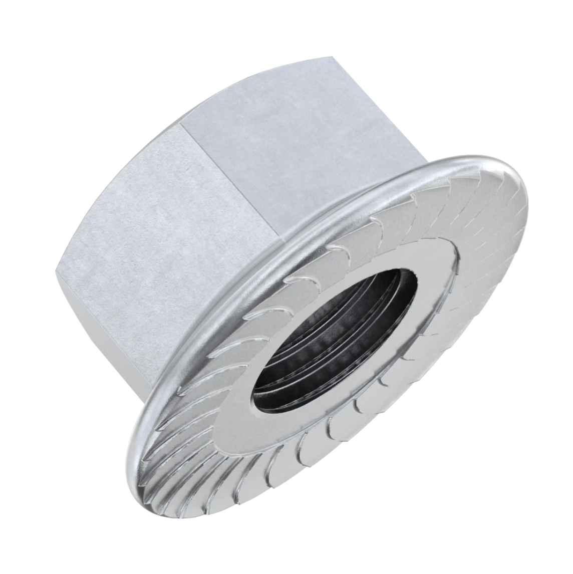 DIN 6923 - гайка шестигранная с фланцем. Фланец гайки может быть рельефным или плоским. Используются для монтажа, соединения и крепления элементов конструкций и оборудования совместно с болтами, шпильками. Применение таких гаек позволяет увеличить площадь сжатия прикрепляемых материалов, не используя при этом дополнительно шайб. Особо эффективны при установке на неровных поверхностях в условиях вибраций и значительных нагрузок.