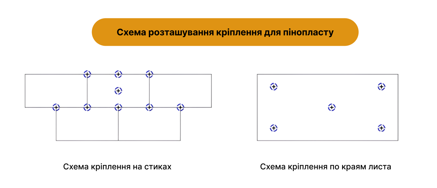 Крепеж производят на стыках утеплителя, так чтобы шляпка прижимала сразу несколько листов, и от одного до трех симметрично по центру каждого листа.