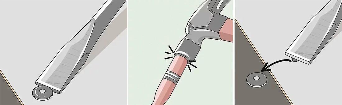 - Чтобы извлечь наклепку, поместите между бортиком ее головки и листом долото или жало отвертки и, аккуратно постукивая молотком, отогните его. Чем тоньше соединенный крепежом материал, тем деликатнее нужно относиться к работе. Также стоит внимательно отнестись к выбору инструмента – он должен быть достаточно тонким, чтобы его можно было аккуратно забить под бортик.