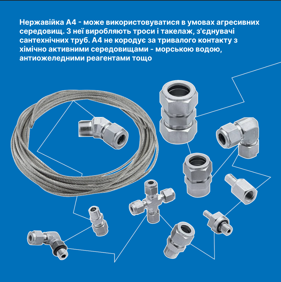 Нержавейка А4 — может использоваться в условиях агрессивных сред. Из нее производят тросы и такелаж, соединители сантехнических труб. А4 не корродирует при длительном контакте с химически активными средами с морской водой, антигололедными реагентами и т. п.