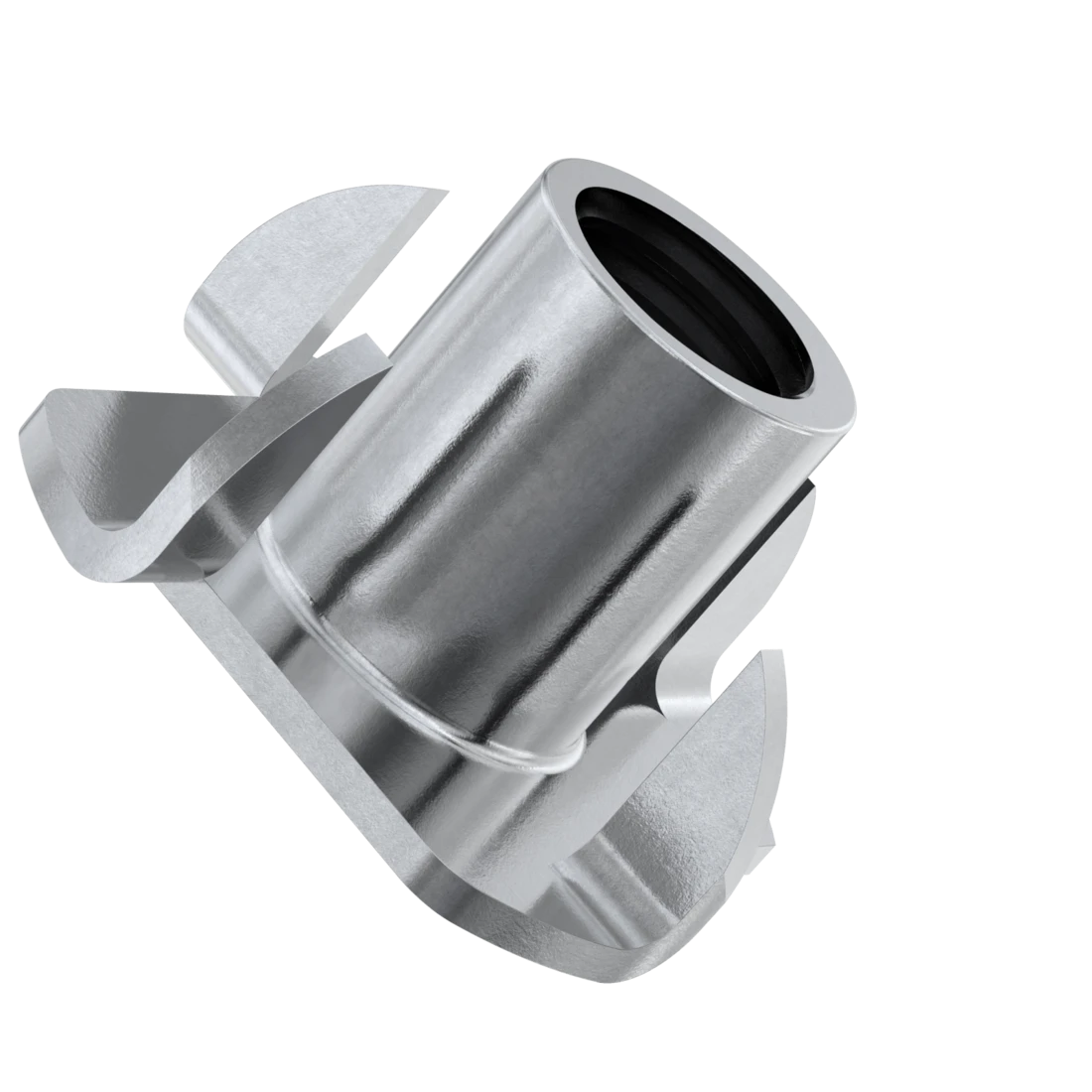Гайка врезная с зубцами DIN 1624 имеет тонкий цилиндрический корпус и зубчатый фланецем. применяется в мебельном производстве совместно с метрическим винтами для соединения элементов из дерева, фанеры, древесностружечных плит и композитных материалов. Она позволяет получить резьбовое гнездо в древесине для стабильной и прочной винтовой сборки, не нарушающей эстетику мебели.
