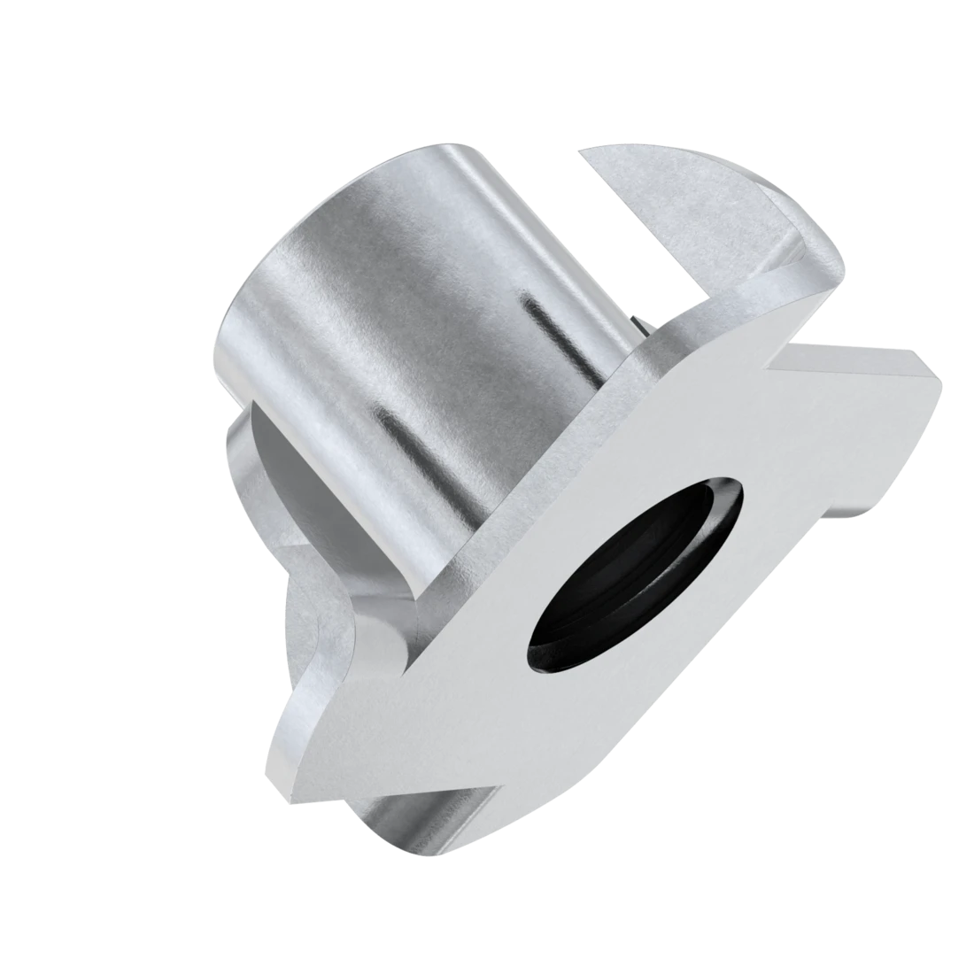 Гайка врезная с зубцами DIN 1624 имеет тонкий цилиндрический корпус и зубчатый фланецем. применяется в мебельном производстве совместно с метрическим винтами для соединения элементов из дерева, фанеры, древесностружечных плит и композитных материалов. Она позволяет получить резьбовое гнездо в древесине для стабильной и прочной винтовой сборки, не нарушающей эстетику мебели.