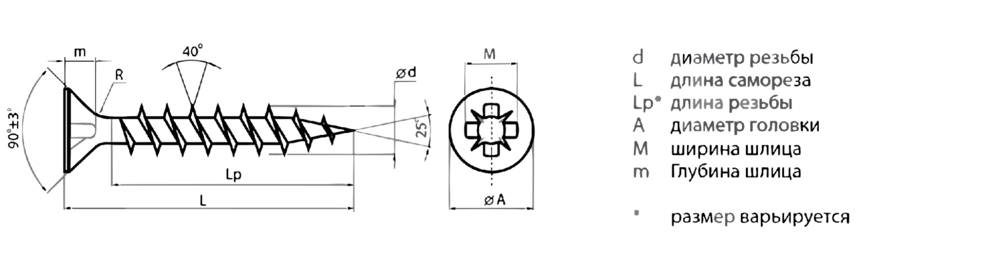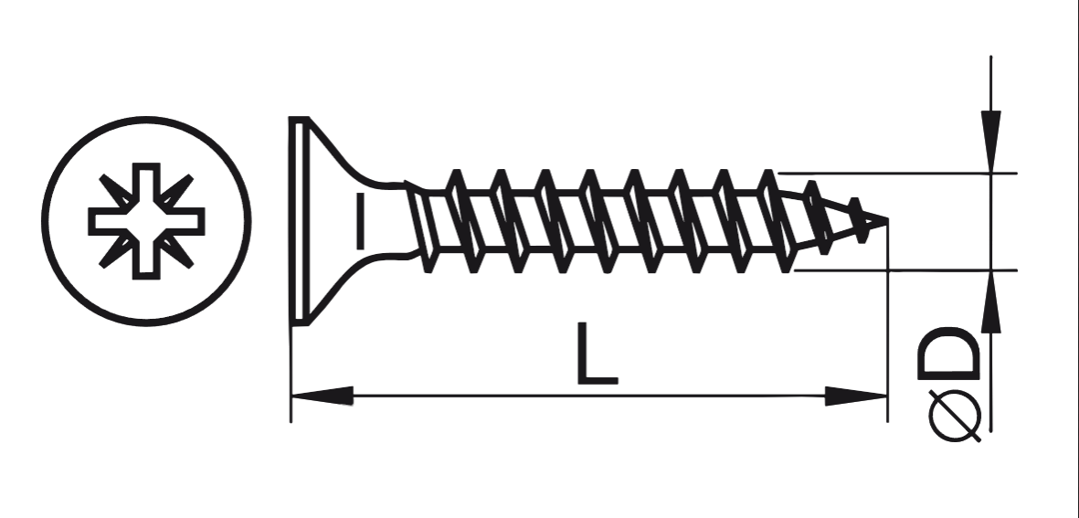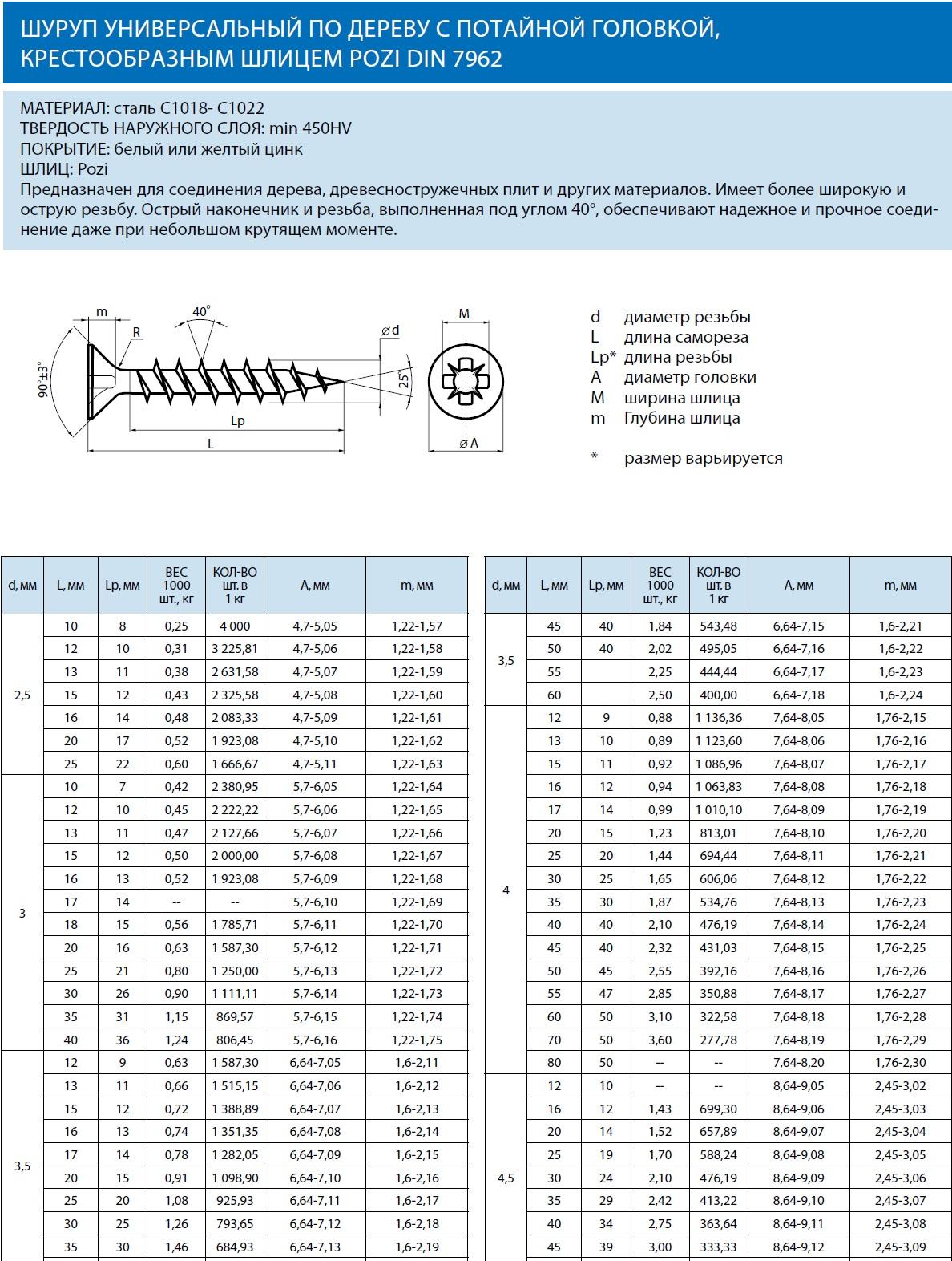 Потайная головка — преимущество, которое достигается при установке крепления: головка углубляется, утапливается в материал. Особенность потайной головки у шурупа универсального состоит в двухступенчатом скосе: сначала в рабочий материал заходит часть элемента, края которого образуют угол 450, а затем более раскрытая шляпка - 900. Такое поэтапное вкручивание делает монтаж более аккуратным, с лучшим прилеганием стенок потайной головки. Шлиц на ней — один из самых распространенных — Pozidriv.