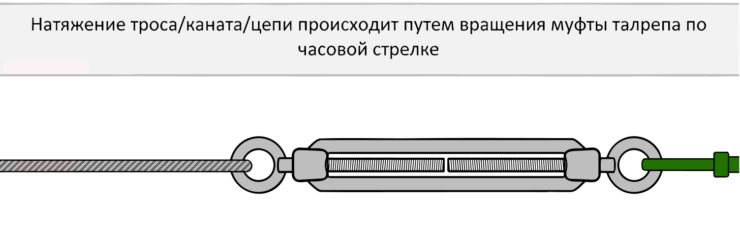 Вкручивая и выкручивая винты можно управлять натяжением растяжки или троса. Талрепы работают только с нагрузками, направленными вдоль их оси, это следует помнить и избегать других приложений сил.