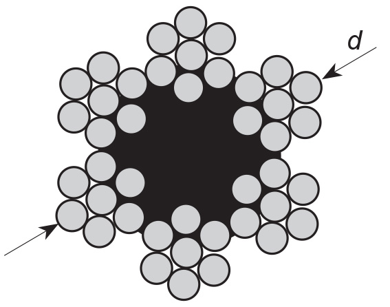 Для определения диаметра каната необходим штангенциркуль. Замеры выполняют в двух поперечных сечениях, расстояние между которыми не менее 1 м. В каждой точке диаметр замеряют в двух взаимно перпендикулярных плоскостях. Для нового каната среднее арифметическое значение этих замеров должно быть внутри поля допусков, указанных для номинального диаметра.