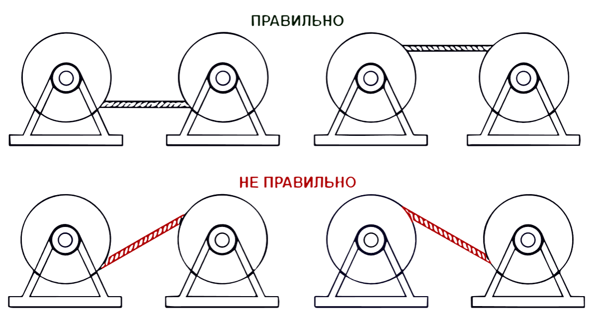 Расстояние между барабанами должно быть не менее 300 диаметров каната. В процессе монтажа канат должен претерпевать минимальное количество перегибов, особенно знакопеременных.