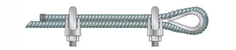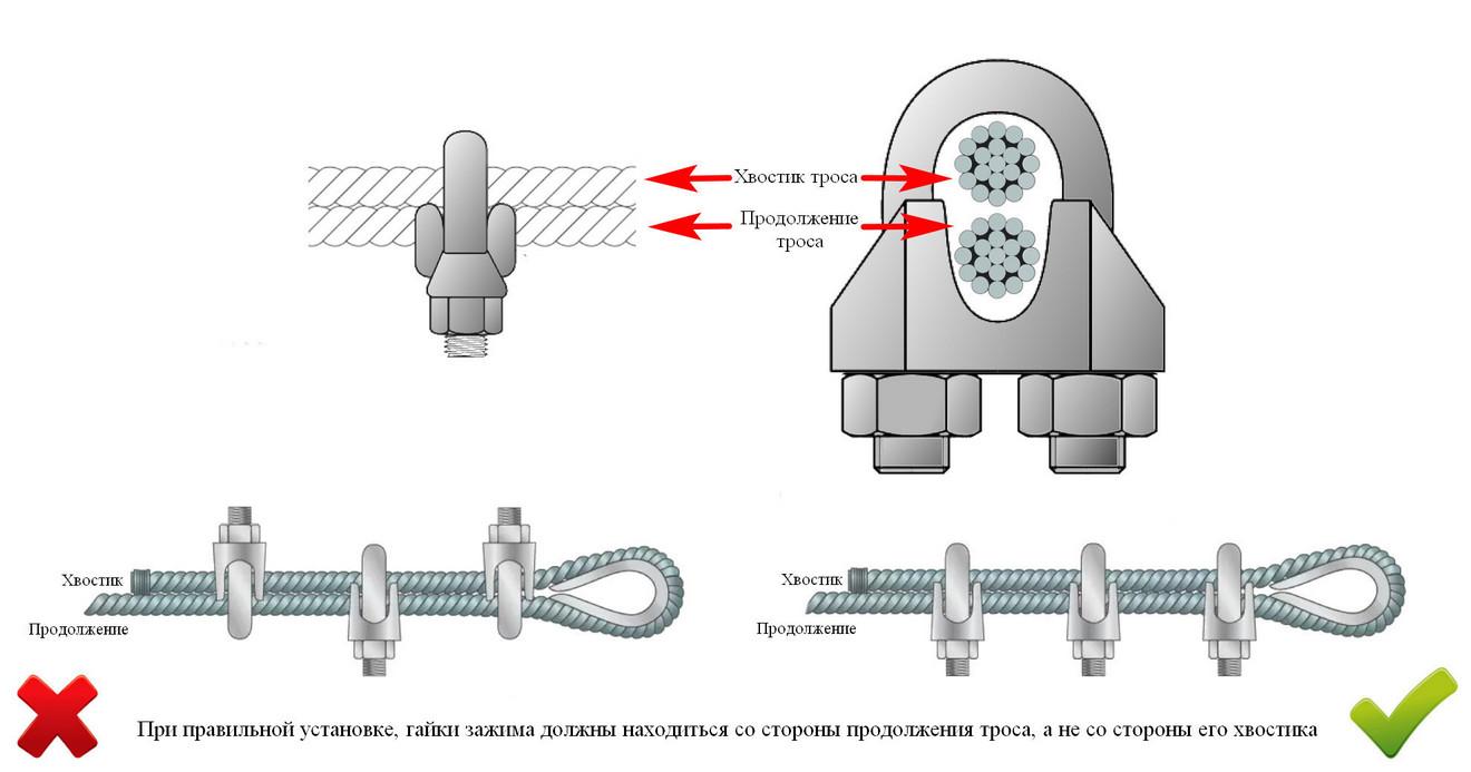 Тросовый (канатный) зажим применяется для создания петель на концах тросов и для соединения стальных тросов, канатов между собой. Не предназначен для грузоподъёмных работ. Необходимо устанавливать не менее 3-х зажимов на одно соединение.